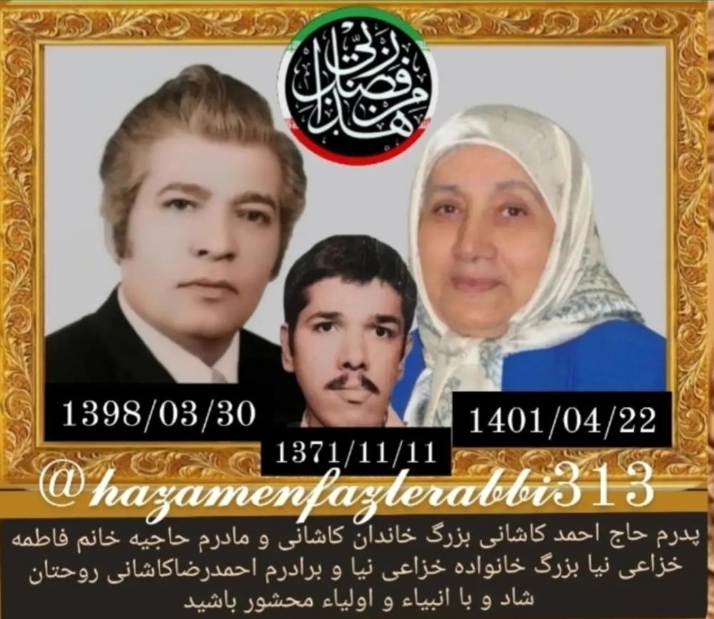 پدرم حاج احمد کاشانی بزرگ خاندان کاشانی و مادرم حاجیه خانم فاطمه خزاعی نیا بزرگ خانواده خزاعی نیا و برادرم احمدرضاکاشانی روحتان شاد و یادتان گرامی و جاودان May my father Haj Ahmed Kashani, the elder of the Kashani family, and my mother, Hajieh Khanum Fatemeh Khazainia, the elder of the Khazainia family, and my brother Ahmad Reza Kashani, may your soul be happy and be with the prophets and saints.