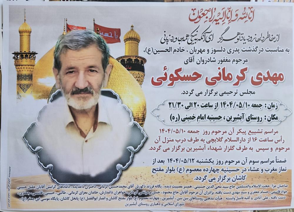 خادم اهل بیت، موذن مسجد چهارده معصوم کاشان، کربلایی مهدی کرمانی حسکوئی در سن ۷۰ سالگی، شب جمعه و سالروز شهادت امام حسن مجتبی (ع) به دلیل ایست قلبی، به دیار باقی شتافت 🖤