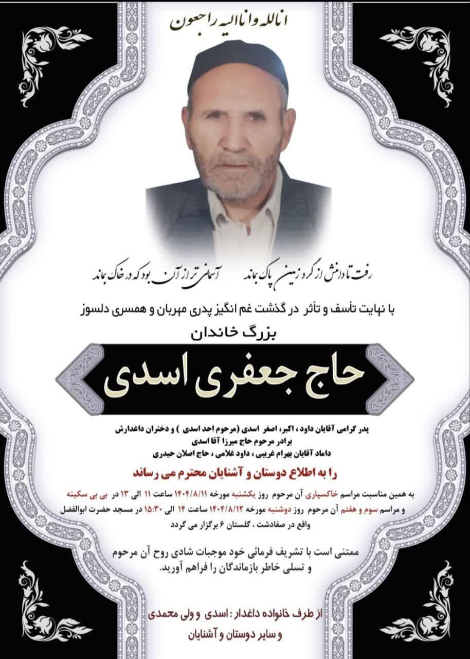ضایعه درگذشت پدر گرامیتان مرحوم آقای حاج جعفری اسدی موجب تاسف فراوان گردید .